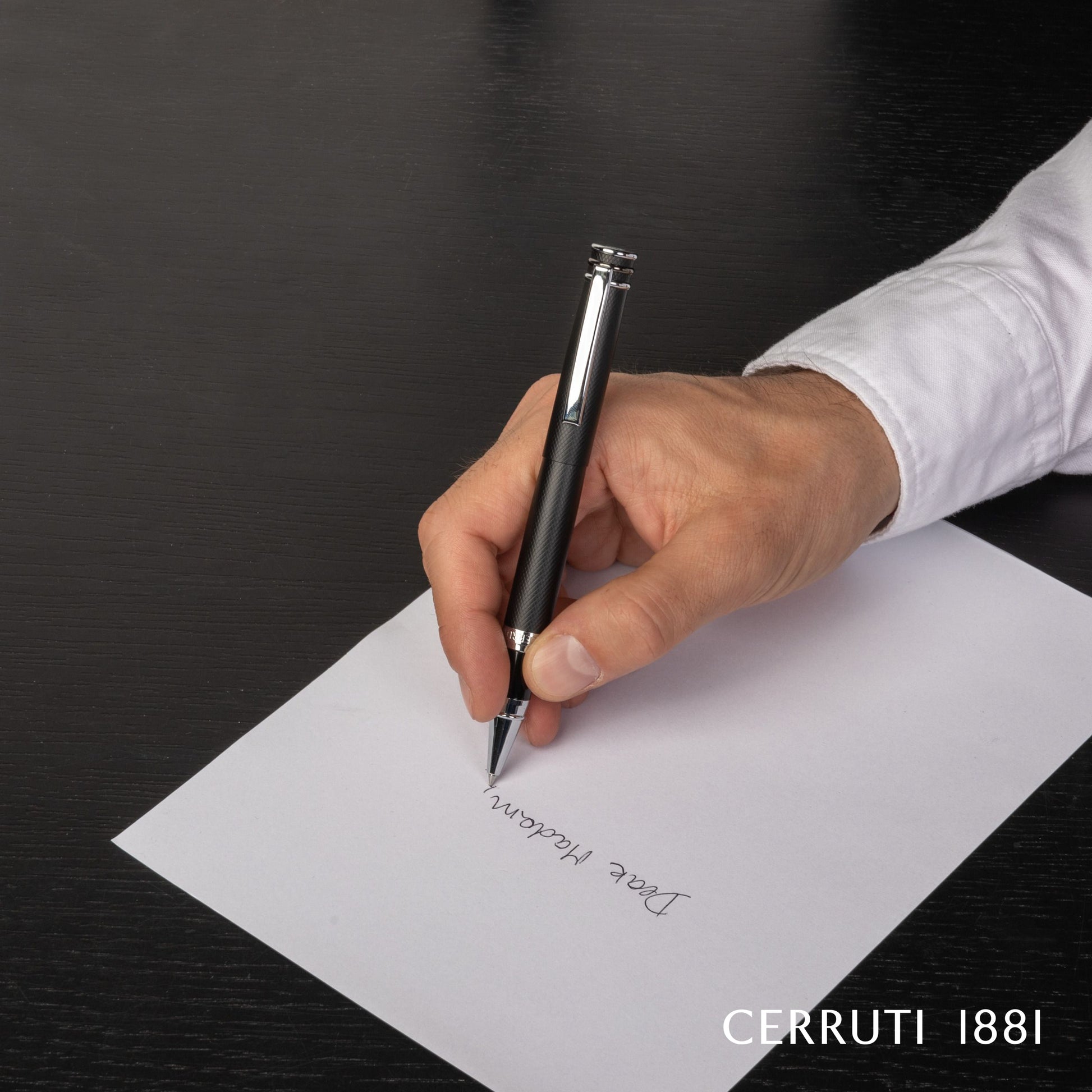 The "Austin" pen is built on one of Cerruti's most iconic silhouette : the ring top. In this new iteration, we are playing with a diamond cut engraved surface adorned with beautifully plated metal trims. This black version is adorned with bicolor trims : gun & chrome. Bicolor metals are very trendy, yet understated.