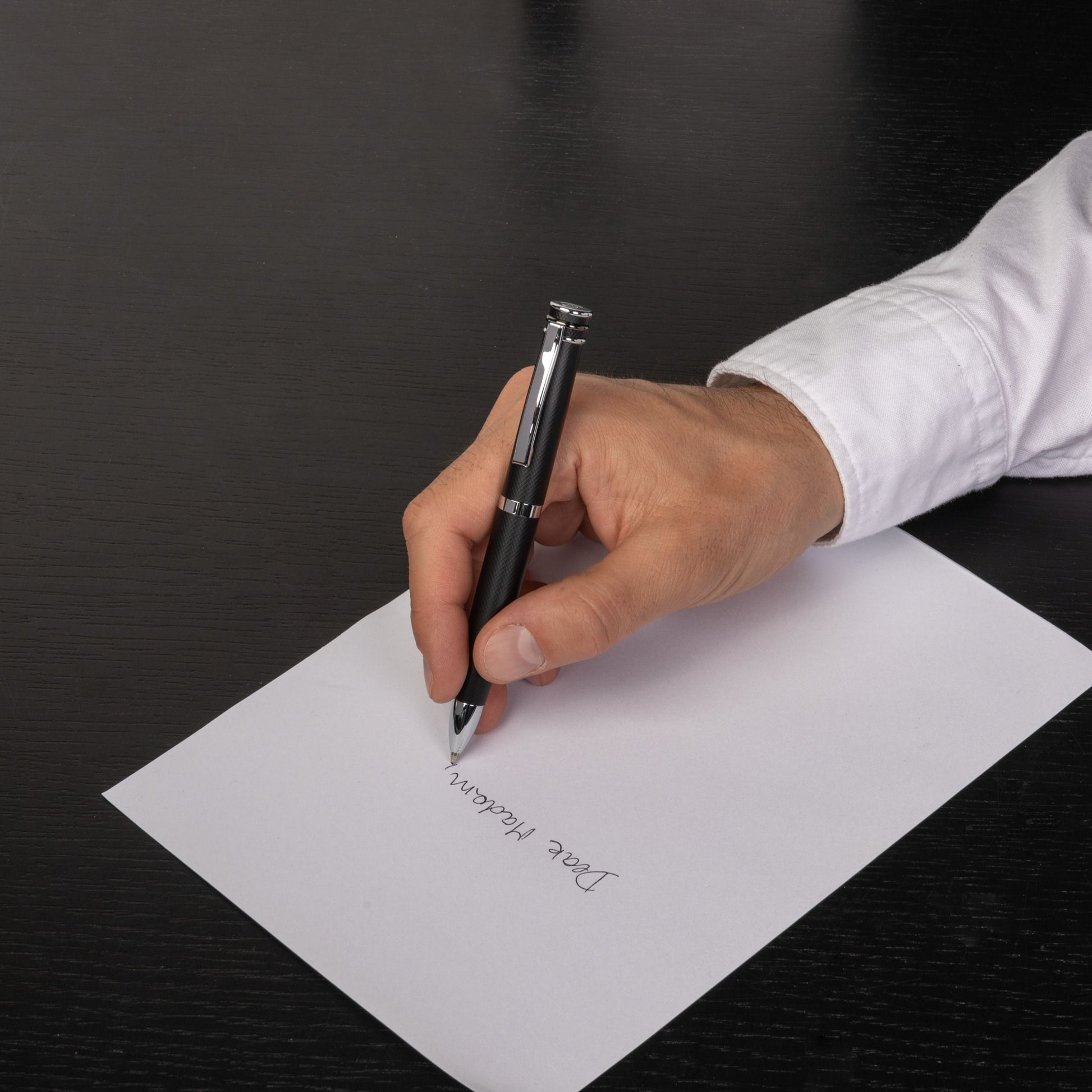 The "Austin" pen is built on one of Cerruti's most iconic silhouette : the ring top. In this new iteration, we are playing with a diamond cut engraved surface adorned with beautifully plated metal trims. This black version is adorned with bicolor trims : gun & chrome. Bicolor metals are very trendy, yet understated.
